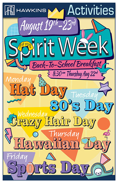 At Hawkins, we not only embrace Back-to-School week but also celebrate Spirit week! Each day brings a new challenge tied to the theme of the day. This year we had Hat Day, 80’s Day, Crazy Hair Day, Hawaiian Day, and Sports Day. Super fun week to add a little more fun to our days and to embrace the spirit of days gone by.